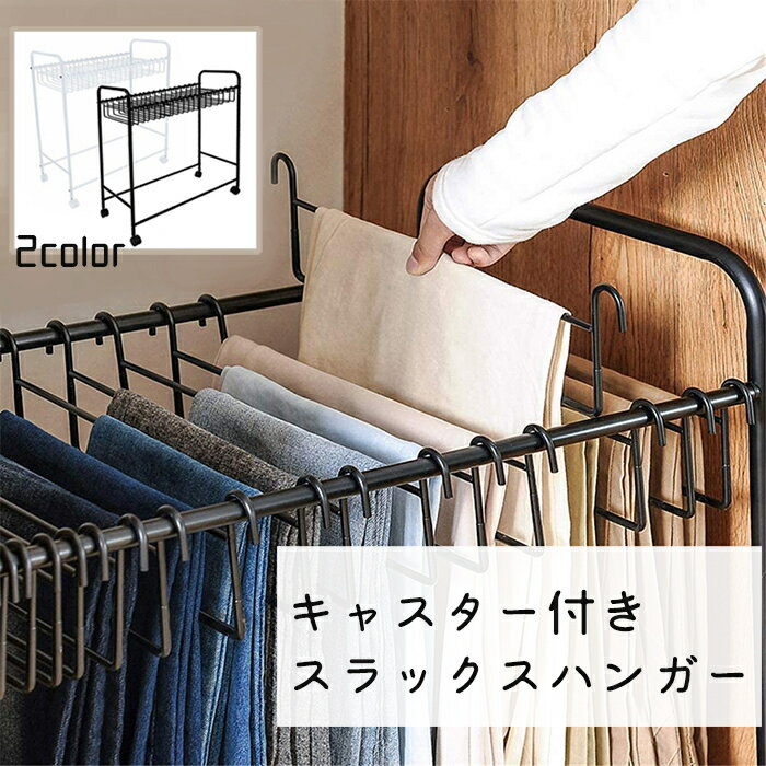 【収納力バツグン◎スラックスハンガー!】 クローゼットの下が有効活用出来る! スラックスやズボンの収納に便利なハンガーラックです マフラーやストールなどもかけて置ける、丁度いい高さです ハンガーは1本ずつ取り外せるので掛ける時も使うときも簡単 キャスター付で移動も楽々でロック付きで固定可能(2個) ハンガーはたっぷり20本付き! 【商品詳細】 サイズ(約):幅75.5×奥行35.5×高さ73.5cm 材質:スチール 耐荷重(約):0.5kg/1本 専用ハンガー20本付き