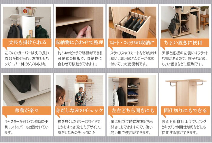 ■商品の仕様/本体:強化プリント紙化粧繊維板、ミラー■商品サイズ/本体:(約)幅80.5×奥行40.5×高さ165cm■扉内寸/(約)幅24×奥行35×高さ(上)104(下)50.5cm■ハンガーバー下高さ/(約)(左)147.5、(右)87.5cm■パンツハンガー内寸幅/(約)30.5cm■棚板/可動式5枚(6.4cmピッチ・上11段階、下5段階)■付属品/パンツハンガー6本■キャスター付き(内2個ストッパー付き)■耐荷重量/ハンガーバー:(約)5kg、棚板:(約)3kg■商品重量/(約)29kg■中国製■組立品(組立て時間:約60分) お支払い方法 ■銀行振込・郵便振替・クレジットカード・代金引換(配送便により不可地域もあります) 配送方法 ■送料について/沖縄・離島は都度見積となりますので恐れ入りますが事前にお問い合わせ下さい。