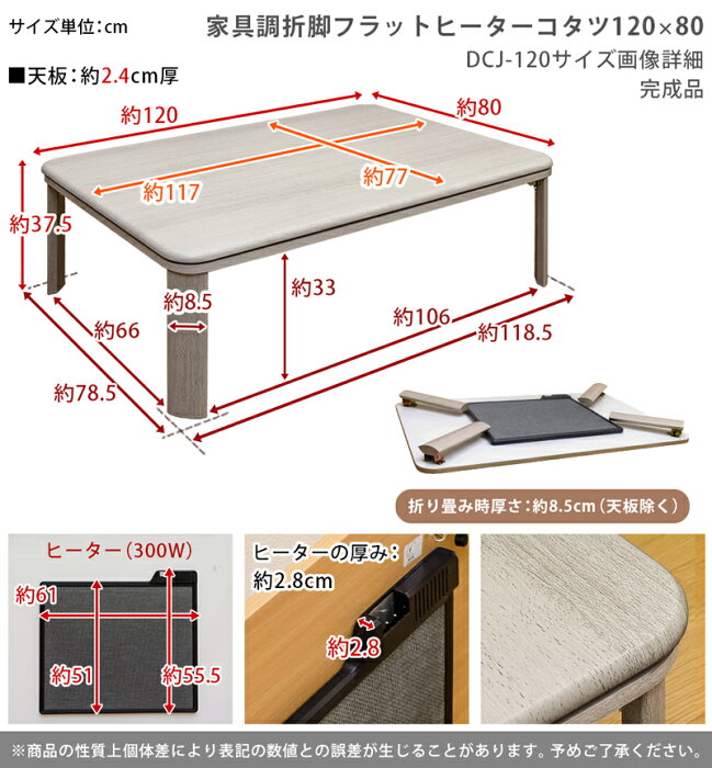 カラー ウォールナット(WAL) ホワイト(WH) サイズ (W)幅120×(D)奥行80×(H)高37.5cm ヒーター厚:約28mm 天板厚:約24mm 材質 天板:合成樹脂化粧繊維板(PVCシート貼り)、フラッシュ構造(芯材ハニカム使用) 脚:合成樹脂化粧繊維板(PVCシート貼り) ヒーター:300Wフラットヒーター(無段階温度調整式電子コントローラー、コード約3m) ※ヒーター着脱可能 重量 25.2kg 梱包サイズ W125×D81×H14cm 27.5kg 送料 送料無料 沖縄県配送不可 原産国 インドネシア